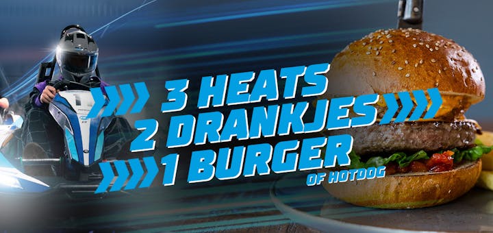 3 keer karten, 2 drankjes en 1 pizza. Het ultieme pakket voor een middag of avond karten met vrienden. Elke coureur neemt deel aan drie sessies van 12 minuten. Tussen elke sessie heb je een korte pauze om even op adem te komen en je klaar te maken voor de volgende sessie. Kijk hoe andere het doen en verbeter elke sessie je tijden! Je 2 drankjes kan je tussendoor consumeren of na het karten samen met je burger of hotdog!