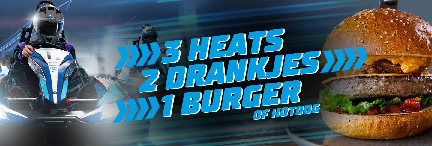 321 Pakket: 3 heats karten, 2 drankjes & 1 burger of hotdog naar keuze!