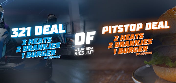 3-2-1 Deal Onze klassieker: 3 heats karten, 2 drankjes en 1 burger of hotdog. Voor wie zin heeft in een volle avond actie en gezelligheid.